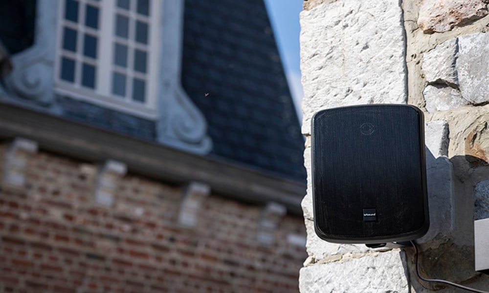 Eén luidspreker dekt indicatief kleinere zones; voor grotere terrassen of lange ruimtes schaal je eenvoudig op. Zo bouw je een consistent klankdek naar behoefte.