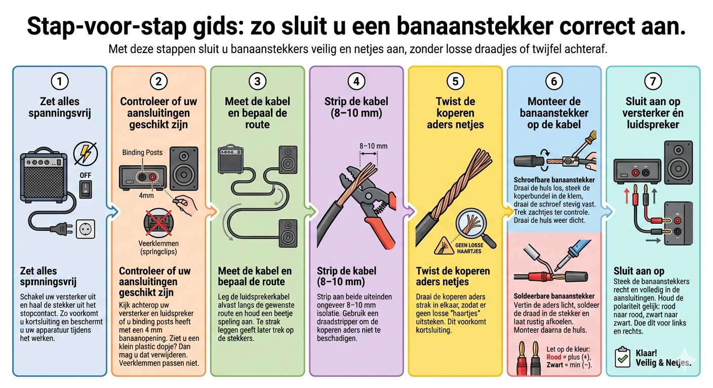 Het aansluiten zelf is geen hogere wiskunde, maar een paar stappen verdienen aandacht. In deze gids leggen we rustig uit wat een banaanstekker is, wanneer u ze gebruikt en hoe u ze correct aansluit, zodat uw set veilig werkt en u zonder twijfel kunt luisteren.