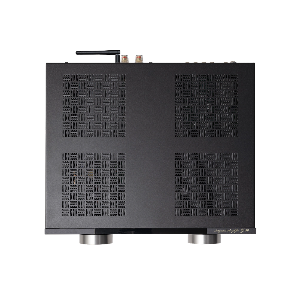 Met 35 cm breedte en 4,9 kg past de Y‑50 makkelijk in een meubel of rek. Klasse D-versterking houdt warmte en verbruik laag; stille stand-by wanneer je niet luistert.